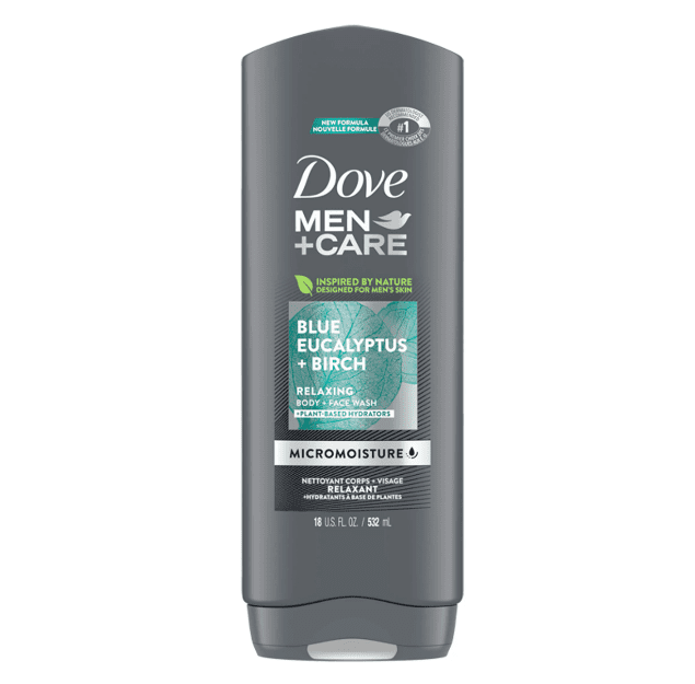 Men's skin is 25% thicker and contains higher levels of protein. That means more sweat; lower hydration levels; and easily irritated skin. So; forget about harsh soaps. Try Dove Men+Care Elements Blue Eucalyptus+Birch Body and Face Wash to your men's skin care and shower routine! This body wash for men is specifically designed for men's skin by the #1 dermatologist recommended men's brand since 2013. Typical soap for men strips away oil and other essential skin components leaving you with dry; flaky; and irritated skin. Dove Men+Care is a mild cleanser with plant-based moisturizers and skin-strengthening nutrients to help rebuild skin and skin proteins. Dove Men+Care Body and Face Wash is an easy-to-rinse; hydrating body wash that is clinically proven to fight dry skin better than a regular men's body soap or shower gel. It is also gentle enough to use as a face wash for men. This body wash is infused with the scent of natural eucalyptus to relax the senses. It's also just as effective for cleansing hands. For best use; squeeze Dove Men+Care Body and Face Wash on to your palm and rub your hands together to work the shower gel into a light foam to activate the MicroMoisture Technology. Apply to your body and face. Rinse thoroughly. Dove Men+Care champion active fathers and the need for paid paternity leave. Find out more about their work in celebrating fatherhood and raising awareness around parental leave on the Dove Men+Care site. And as part of our commitment towards sustainability; each Dove Men+Care body and face wash bottle is recyclable and made with 100% recycled plastic and is PETA certified Cruelty Free.