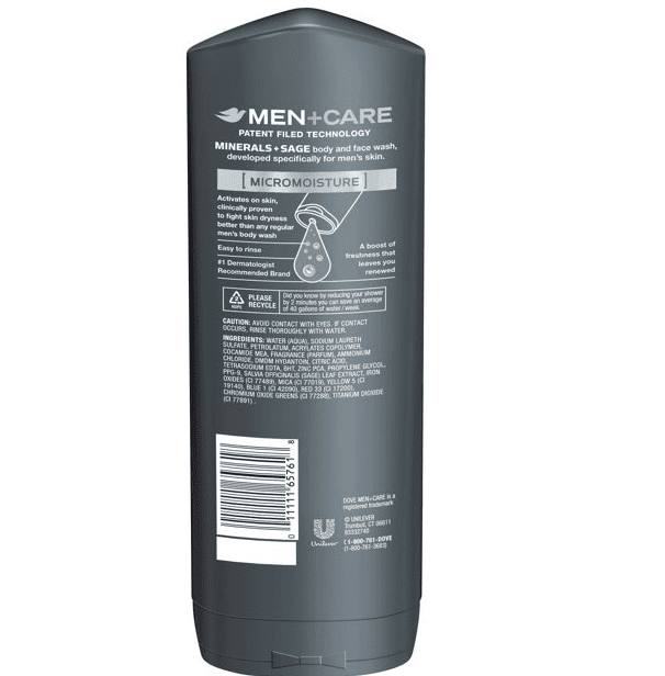 Men’s skin is 25% thicker and contains higher levels of protein. That means more sweat; lower hydration levels; and easily irritated skin. So; forget about harsh soaps. Try Dove Men+Care Elements Minerals+Sage Body and Face Wash to your men’s skin care and shower routine! This body wash for men is specifically designed for men’s skin by the #1 dermatologist recommended men’s brand since 2013. Typical soap for men strips away oil and other essential skin components leaving you with dry; flaky; and irritated skin. Dove Men+Care is a mild cleanser with plant-based moisturizers and skin-strengthening nutrients to help rebuild skin and skin proteins. Dove Men+Care Body and Face Wash is an easy-to-rinse; hydrating body wash that is clinically proven to fight dry skin better than a regular men’s body soap or shower gel. It is also gentle enough to use as a face wash for men. This body wash is infused with minerals and sage for a refreshing shower experience. It’s also just as effective for cleansing hands. For best use; squeeze Dove Men+Care Body and Face Wash on to your palm and rub your hands together to work the shower gel into a light foam to activate the MicroMoisture Technology. Apply to your body and face. Rinse thoroughly. Dove Men+Care champion active fathers and the need for paid paternity leave. Find out more about their work in celebrating fatherhood and raising awareness around parental leave on the Dove Men+Care site. And as part of our commitment towards sustainability; each Dove Men+Care body and face wash bottle is recyclable and made with 100% recycled plastic and is PETA certified Cruelty Free.