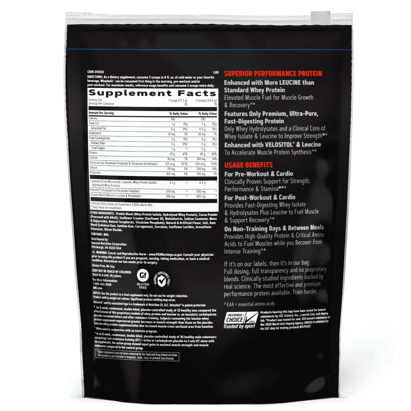 GNC AMP™ Wheybolic® is the premier Clinically Proven Performance Protein. Wheybolic's breakthrough formula is Clinically Proven to increase muscle strength and size by 30% in just 8 weeks and is designed to fuel anabolic muscle support and recovery from intense training. More than just standard whey protein, Wheybolic® delivers ultra-pure, fast-digesting whey protein isolate and hydrolysates that fuel to muscle growth and recovery, as well as 15 grams of Essential Amino Acids (EAAs), including 6.2 grams of L-Leucine. Each serving of GNC AMP Wheybolic™ Protein Powder, Chocolate Fudge, 1.2 lbs, provides 40g protein, 15g EAAs and 6.2g L-Leucine with only 6g total carbs and <2g sugar and is enhanced with 1g of Velositol® and 400mg of digestive enzymes to help get more out your protein and maximize digestion*.