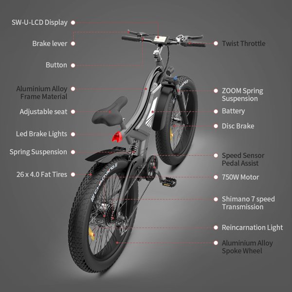 5-Level Pedal Assist System (PAS) w/ Speed Sensor + Right side Twist Throttle & 7-Speed GearsFront and Rear Mechanical Disk BrakesSpecifications:Motor: 750WBattery: 48V15Ah removable lithium batteryDisplay: SW-U-LCDdisplayTire: 26 x 4.0Frame: 6061 aluminum alloyController:48V 22ACharge time:4-6 hoursMax Speed:45km/hRange Distance:25-35kmBrake: F/R disc brakeDerailleur: Outer 7 speed SHIMANOFork:ZOOM/MOZOLight:Front lightPackage Size: 163*28*82cmWeight Capacity: 300LBPackage Lsit:1x 90% Pre-assembled Electric Bike1xTool Kit1xManual1xCharger1xPedal1x Li-ion BatteryNote:Ship USA only (Doesn't include Hawaii; Alaska or Puerto Rico; PO Boxes/APO's)Pls contact us if you need return bike; we will provide return address.