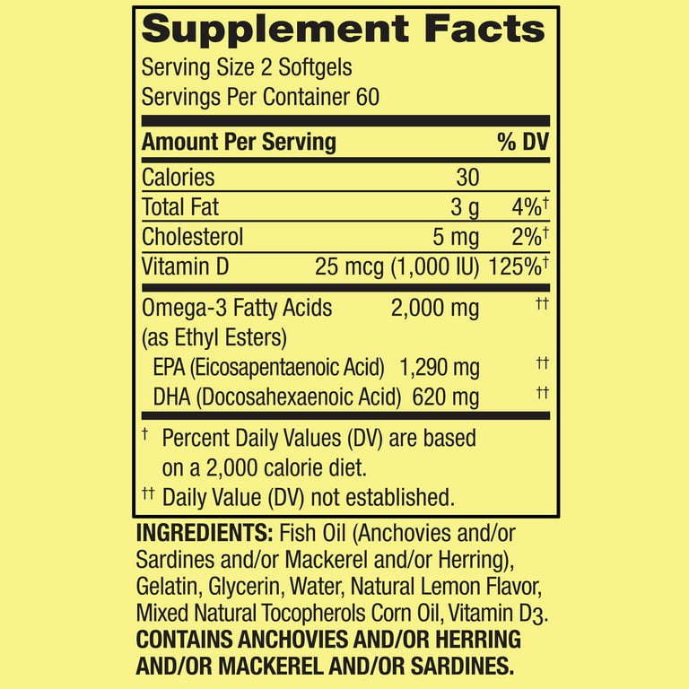 Contains 2000mg of omega-3 fatty acids and 1000 IU of vitamin D3 per serving